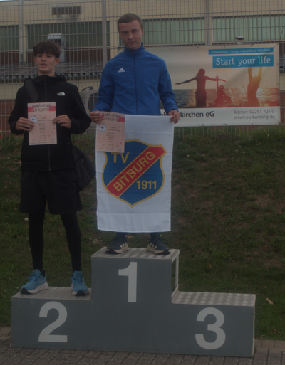 Am 16. März d. J. wurden Paul Hoor und Jonah Lichter vom Trainerteam des TV Bitburg, Abt. Leichtathletik für die Hallen-Rheinlandmeister in Koblenz empfohlen. Gleich bei der ersten Disziplin, im Weitsprung, übernahm der TV Bitburg mit beiden Athleten die Führung, die nicht mehr abgegeben werden sollte. Es entwickelte sich nach der zweiten Disziplin, 50 m-Sprint, ein interner Zweikampf um Platz eins. Gleichzeitig wurde der Punktvorsprung von Paul und Jonah gegenüber den Mitstreitern weiter ausgebaut. Das Kugelstoßen sollte dann die endgültige Entscheidung bringen. Nach dem letzten Stoß war es dann sicher, dass der TV Bitburg den Doppelerfolg auf dem Siegerpodest feiern konnte.